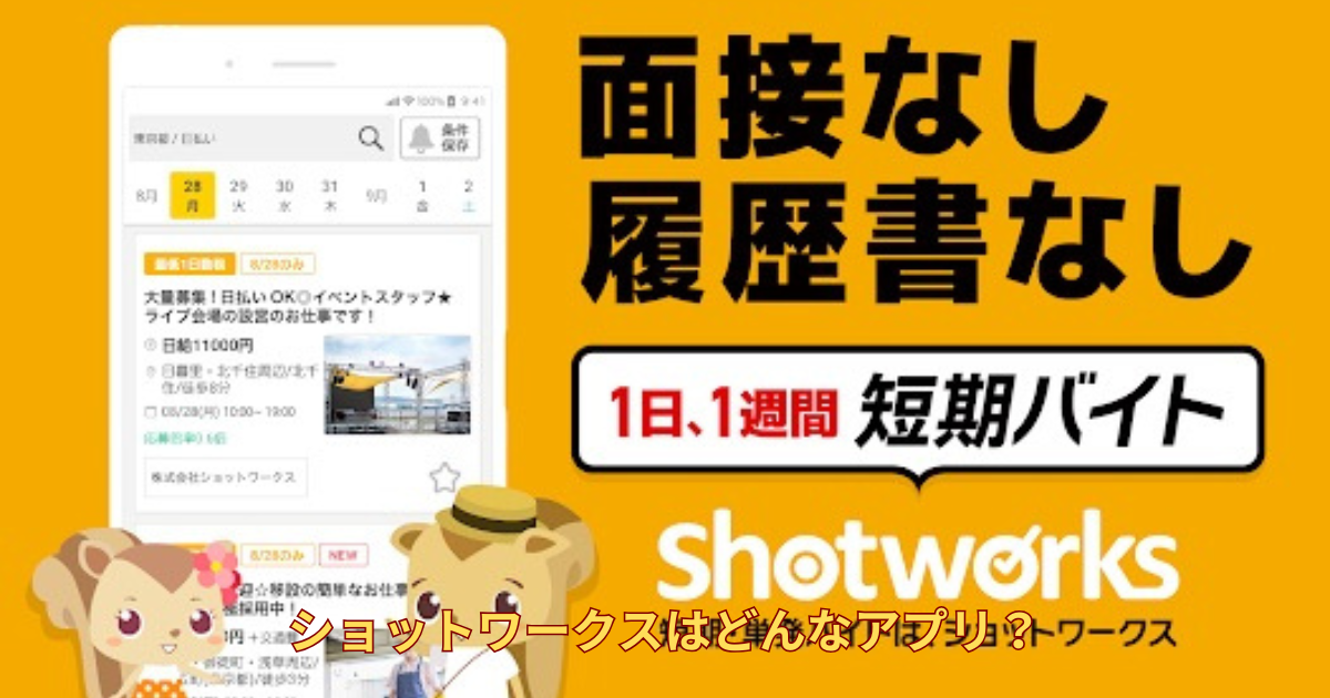 ショットワークスは、短期・単発バイトに特化した求人アプリで、1日だけの勤務や週末限定の仕事を探せるサービスです。